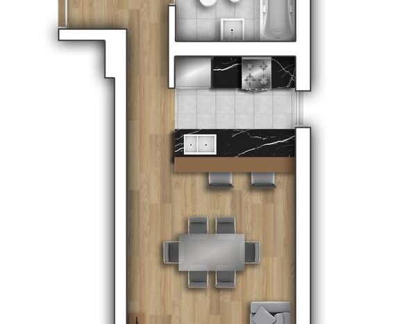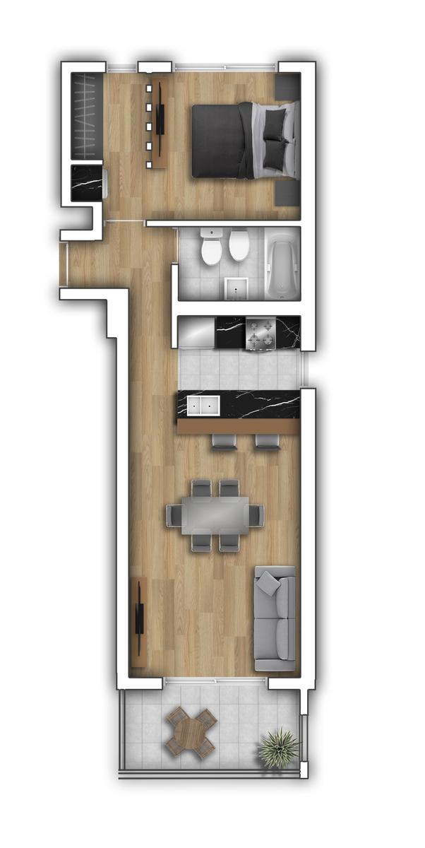 Departamento de un dormitorio con ventilacion cruzada cuenta con cocina comedor, baño y dormitorio, balcon.