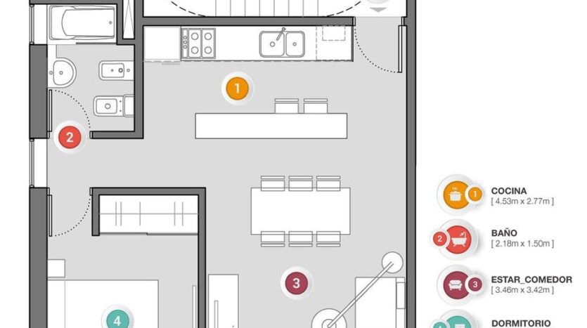 Dispone de cocina integrada con isla, estar comedor con salida al balcón, baño completo, dormitorio con placar y salida a balcón.