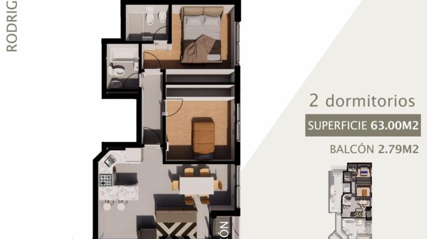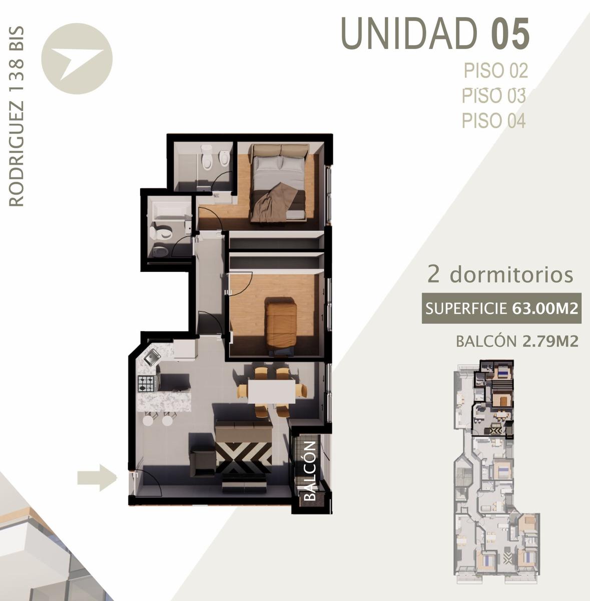 Departamento de 2 dormitorios a estrenar en Zona Río. Pichincha con balcón, orientacion Este. Entrega Febrero 2026.